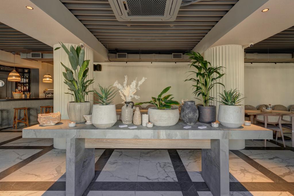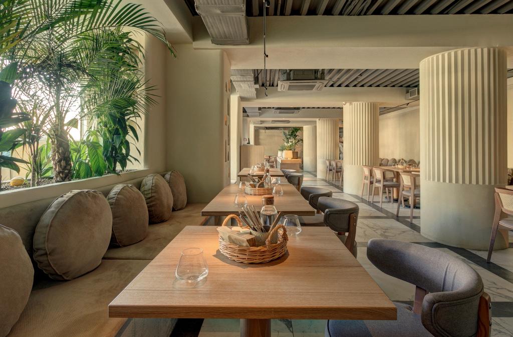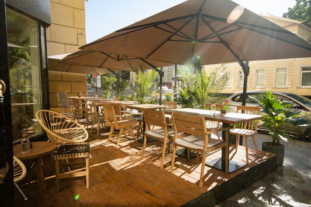 Описание: Светлый днем и с приглушенным светом и свечами вечером зал. Теплые песочные тона, мягкие диваны, колонны между столами и просторный проход  Есть 6 мест за баром..