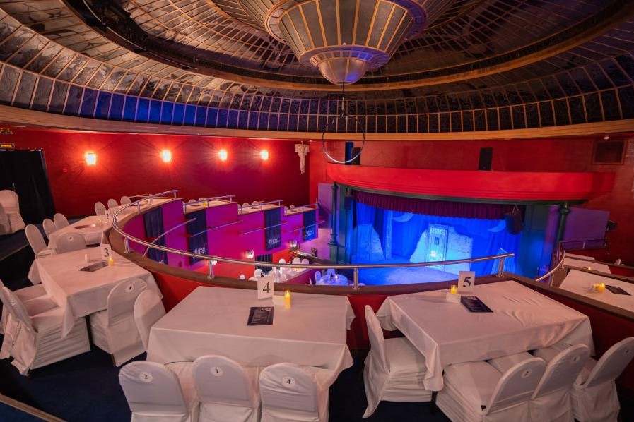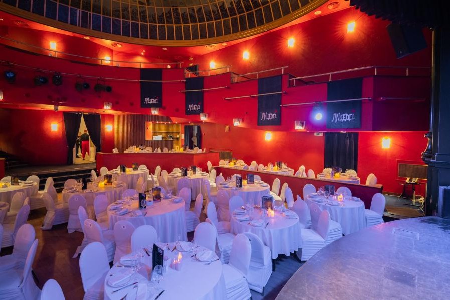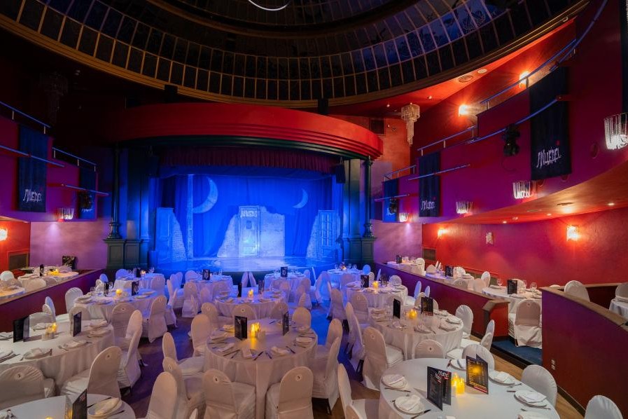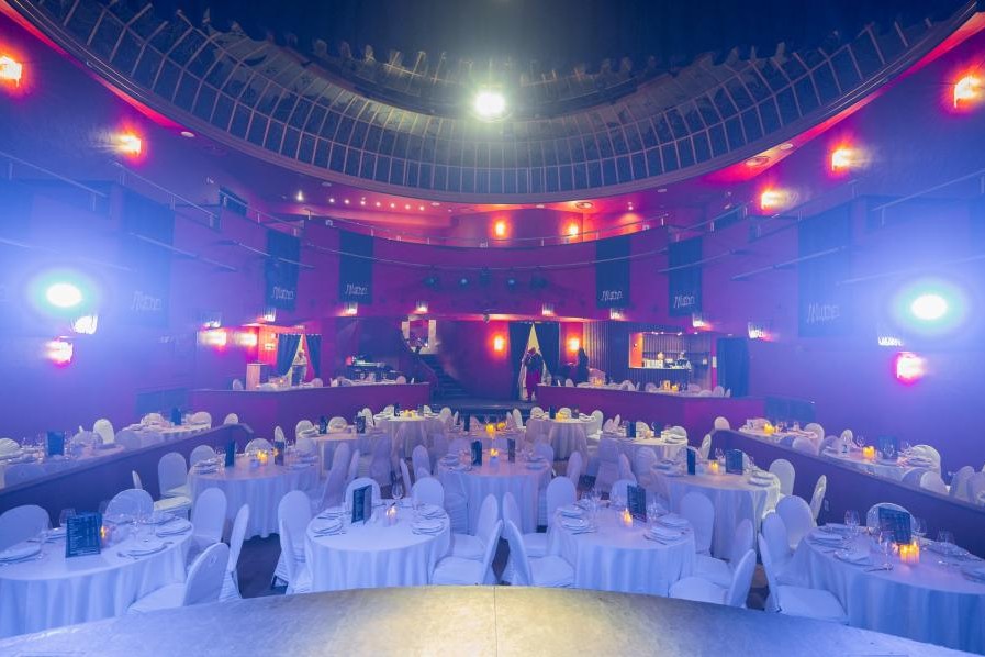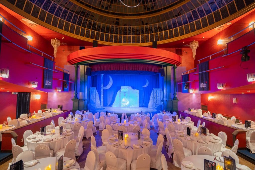 Двухуровневый зал с профессиональной сценой для выступлений и большим светодиодным экраном для презентаций и шоу..