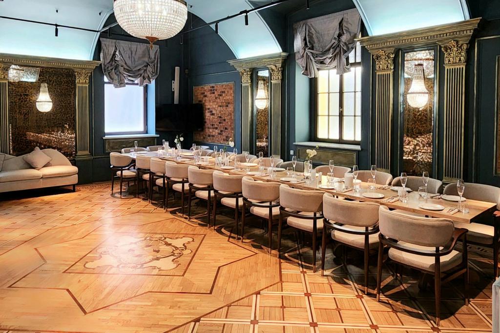 : Большой банкетный зал вмещает 40 гостей на банкетную посадку и 90 гостей под фуршет..