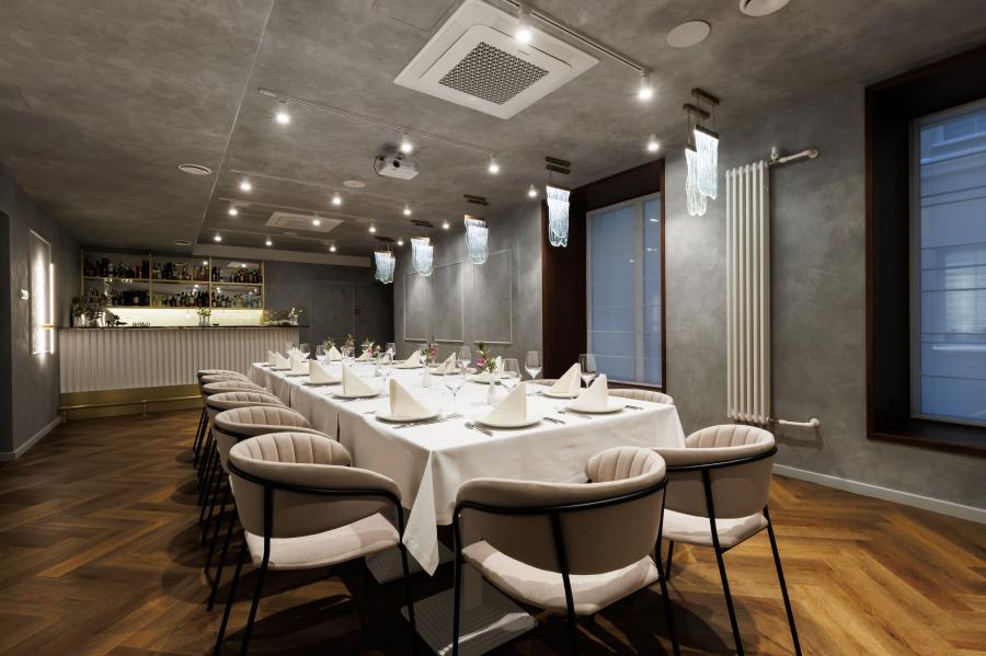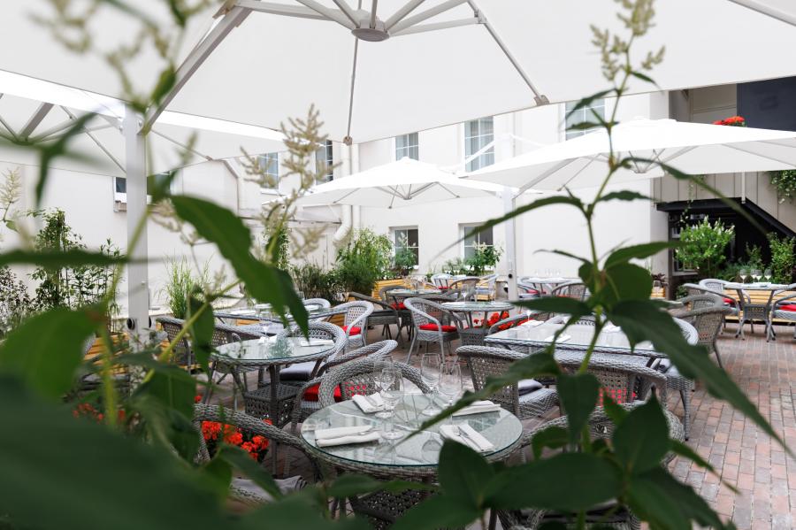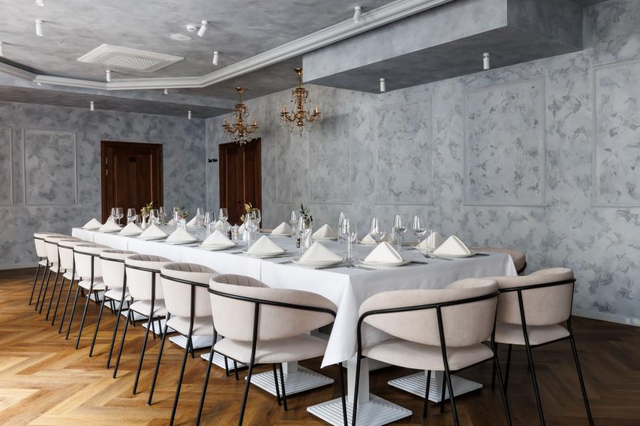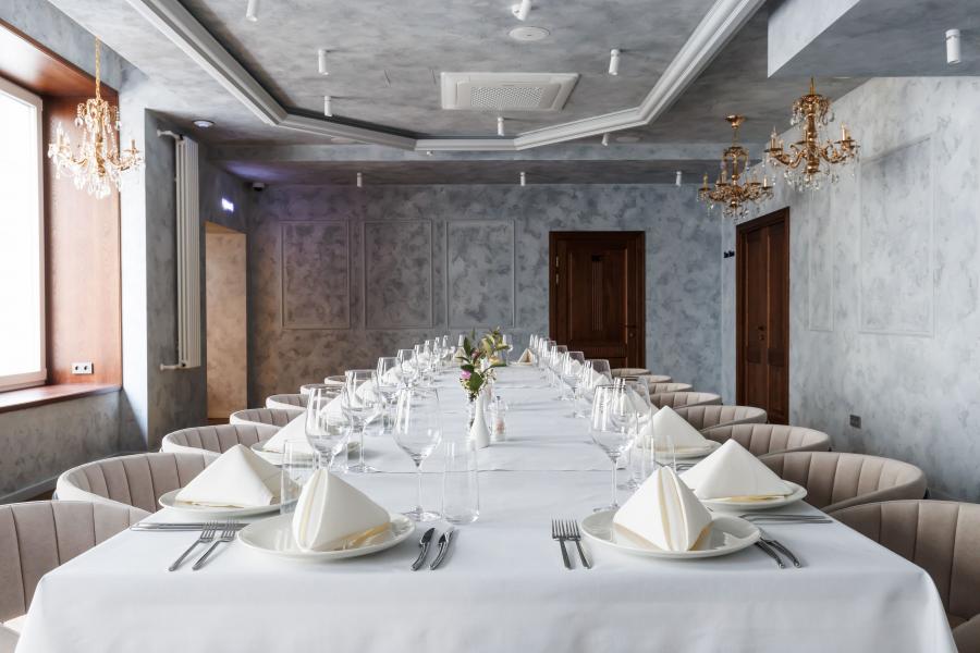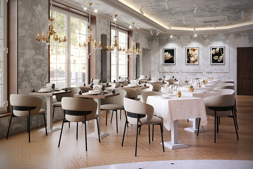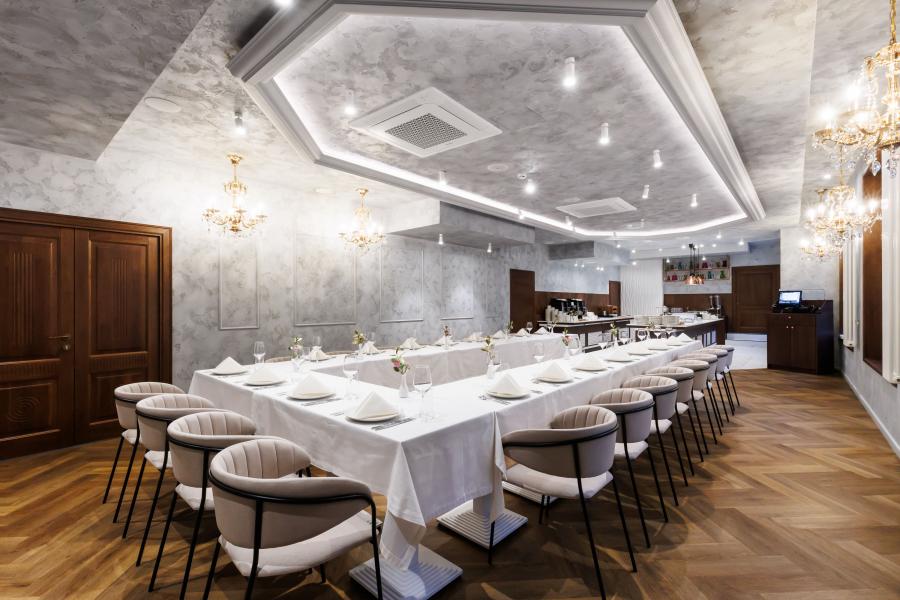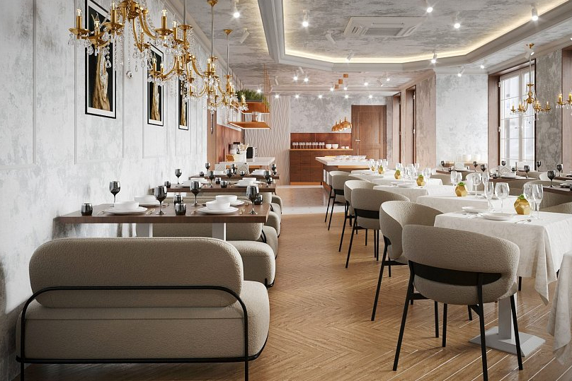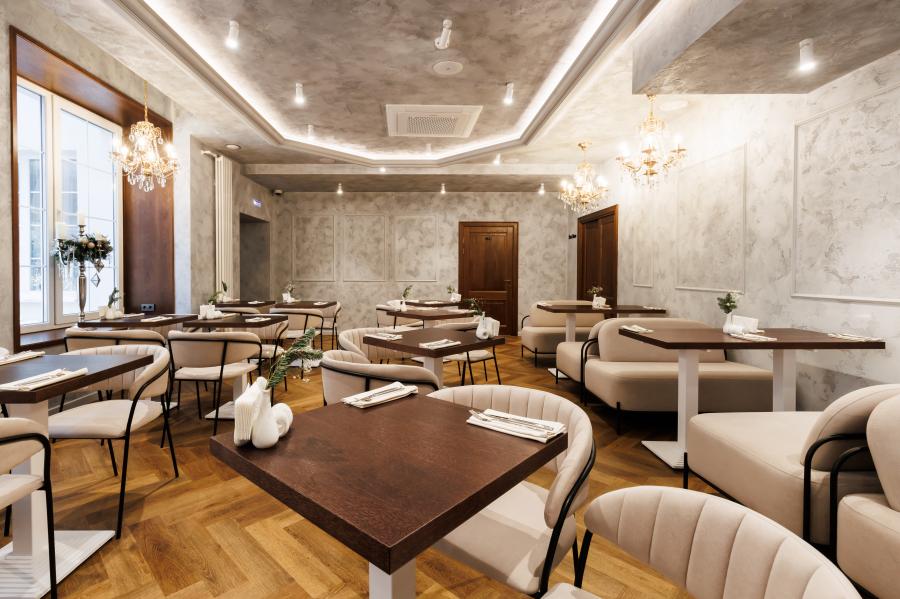 Описание: Высокие панорамные окна, из которых открывается вид в большой внутренний двор. Пастельные цвета, серебро и золото, отсутствие резких контрастов, четкие линии и простая геометрия дополнена парадными люстрами с переливчатыми подвесками. .
